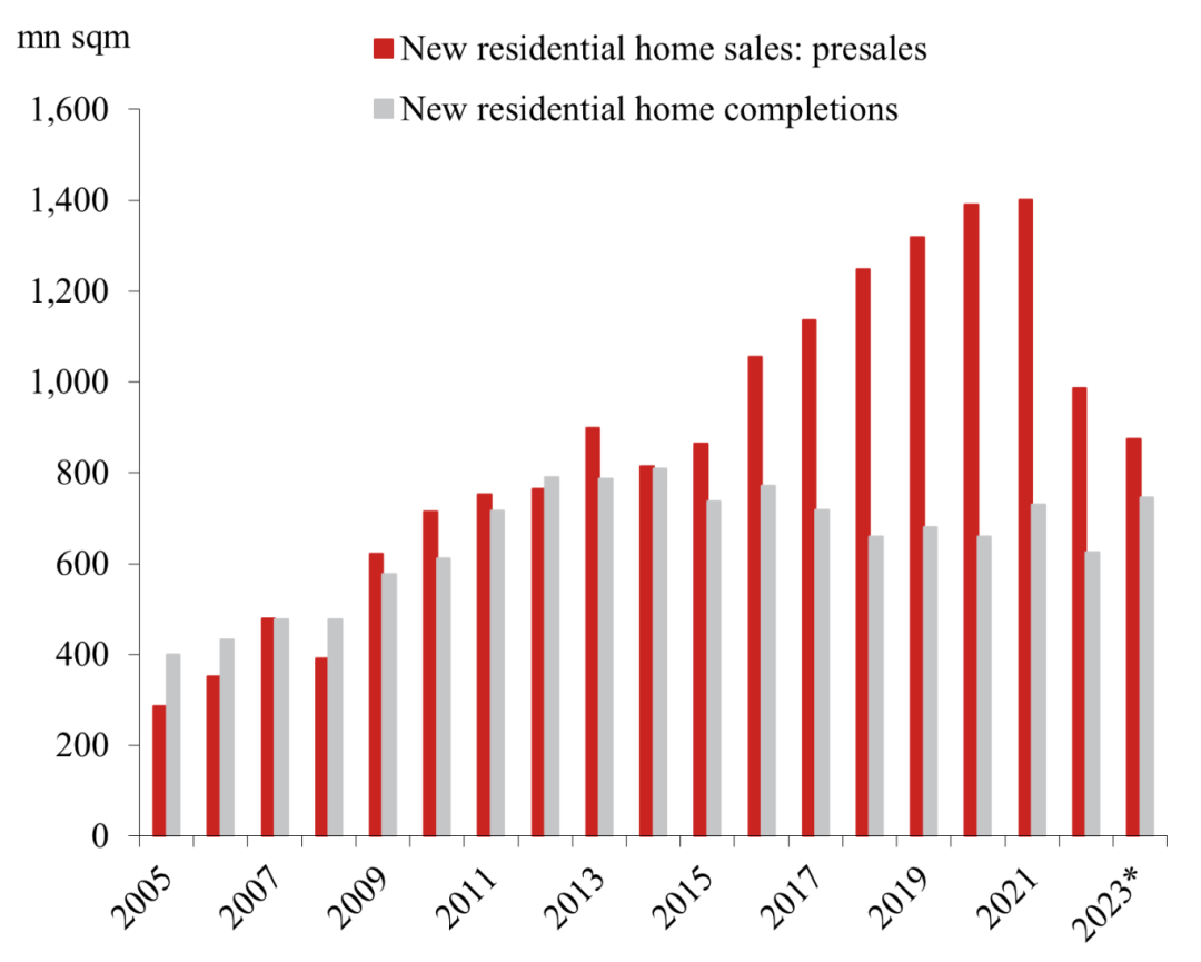 图:中国的预售房和每年开发商完工房的面积