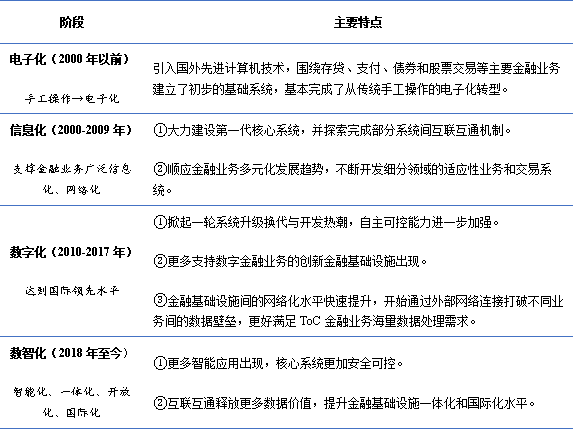 金融基础设施数字化值得我们深入研究,如果没有基础设施数字化,金融机构和金融科技公司也就失去了数字化转型的基础。总体来看,我国金融基础设施的数字化发展经历了电子化、信息化、数字化和数智化四个阶段。回顾我国金融基础设施数字化发展历程,可以看出,我国金融基础设施数字化建设具有以下几个显著特征:一是强调集成化与互联互通,二是坚持创新驱动的数字化升级,三是重视标准体系建设,四是坚持普惠金融导向,五是注重安全可控。