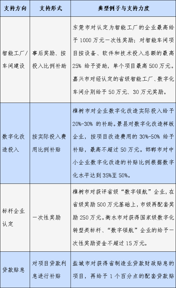二是政策创新,要从当前树典型、抓试点的政策扩大为普惠性政策,对企业是一视同仁、公平公开的政策。比如,虽然当前不少政府出台了支持工业智能化建设的政策,也有了具体形式,形成了典型案例。这些典型是可拷贝可复制的,但需要创新推广政策。比如,东莞市给予优秀智能工厂企业最高1000万元的一次性奖励;樟树市对企业数字化改造实际投入给予20%-30% 的补助;盐城市对获得省制造业贷款财政贴息的项目,再给予1个百分点的配套贷款贴息。各地纷纷出台政策,在智能工厂建设、企业数字化改造方面予以支持。