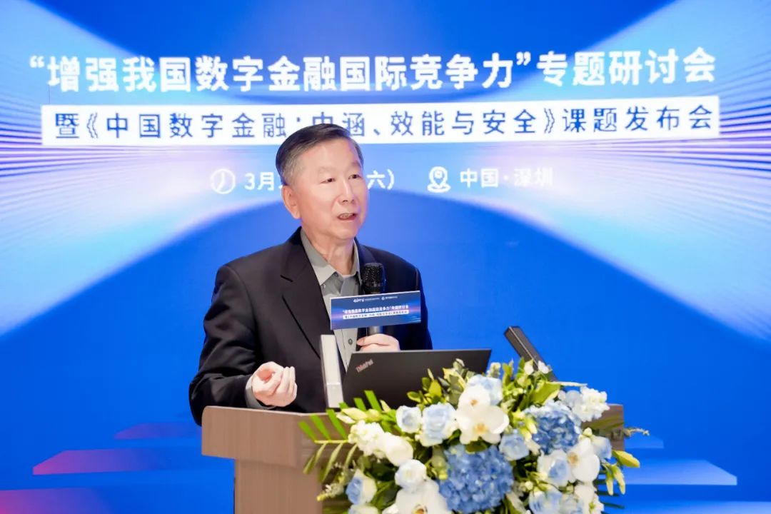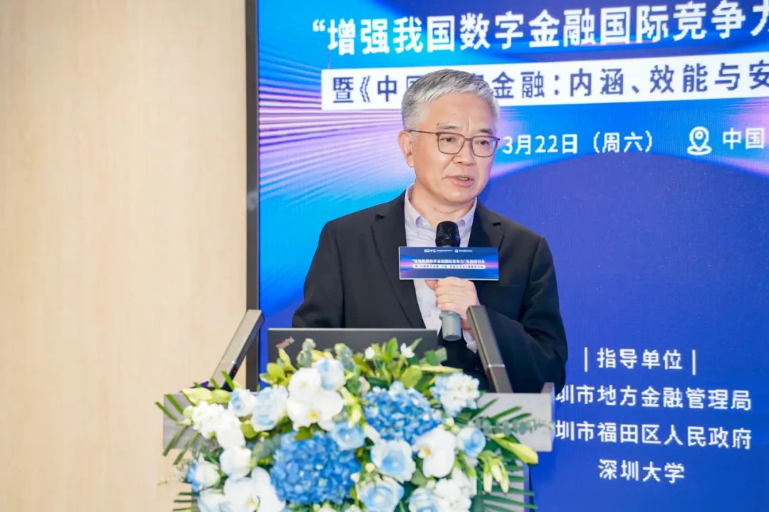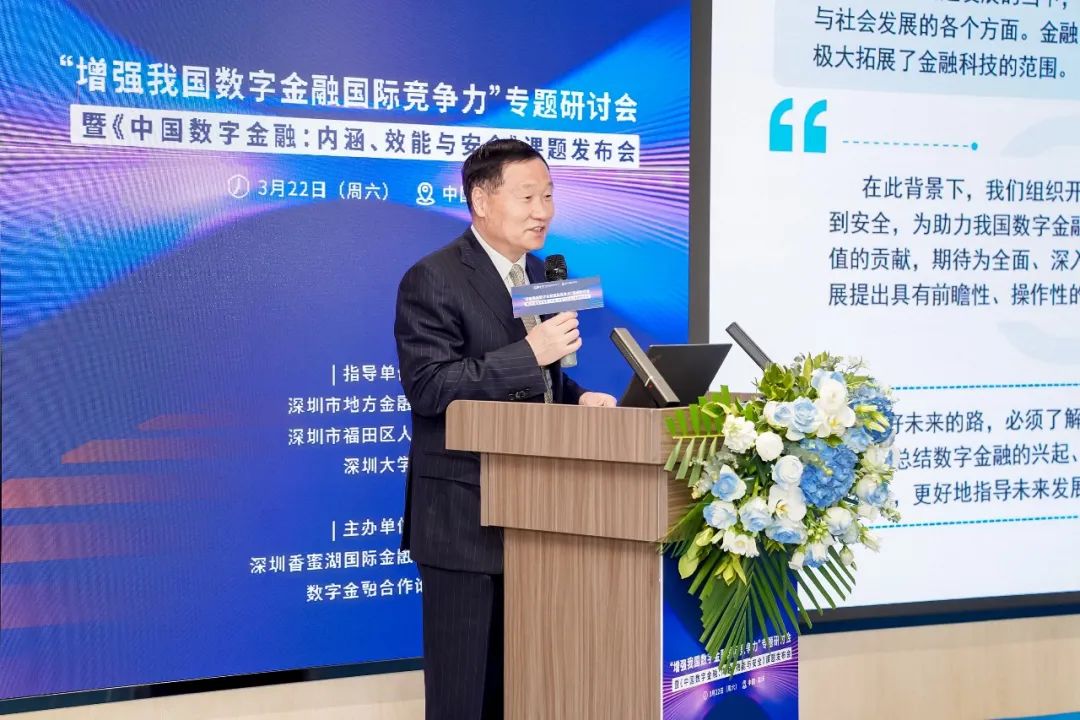 2025年3月22日,由深圳市地方金融管理局、深圳市福田区人民政府、深圳大学指导,深圳香蜜湖国际金融科技研究院与数字金融合作论坛联合组织的“增强我国数字金融国际竞争力”专题研讨会暨课题发布会在深圳市福田区成功举办,会上重磅发布了重大课题报告《中国数字金融:内涵、效能与安全》(以下简称“报告”)。深圳市委金融办常务副主任、市委金融工委常务副书记、市地方金融管理局局长时卫干作开场致辞。中国证监会原主席、我院学术委员会主任肖钢,浙商银行原行长、我院学术委员会委员刘晓春,中国银行业协会原首席信息官、我院学术委员会委员高峰,蚂蚁集团金融研究中心主任唐伟城代表课题组介绍报告主要观点和内容。